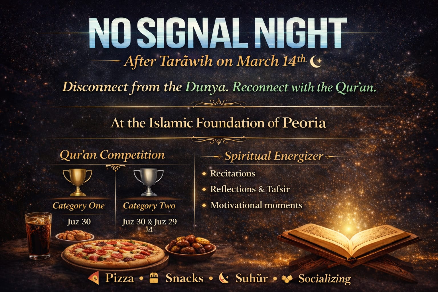 The Islamic Foundation of Peoria will be hosting a Quran and no-signal night for our community.
