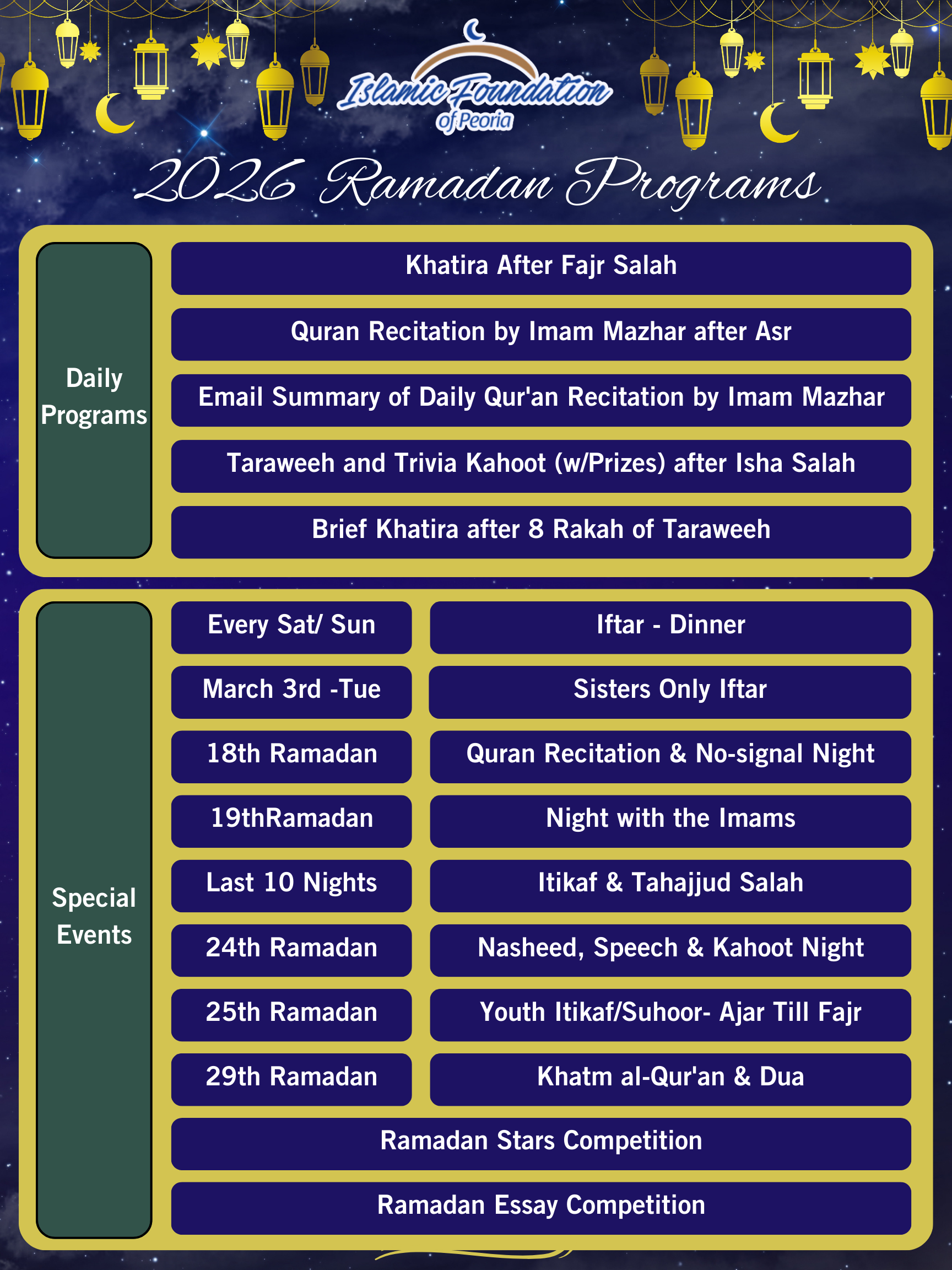 Ramadan 2026Ramadan: the Holy month of Quran+ Add to Google Calendar+ iCal / Outlook export Tags: Ramadan 2026 SearchRecent Posts [IFP] SATURDAY – 2/14 – Pre-Ramadan Masjid Clean up [IFP] 🌙📘 Fiqh of Fasting. Preparing for Ramaḍān with Knowledge 🎙️ Lecture by Imam Mazhar Mahmood [IFP] Iqama Times for February 2026 Seerah Conference Eid Al-Adha 2021 – Details and LogisticsRecent CommentsArchivesFebruary 2026October 2023July 2021December 2020May 2020January 2020August 2019May 2019January 2019June 2018CategoriesCovid-19EidEventsJummah KhutbahRamadanUpdatesMetaLog inEntries feedComments feedWordPress.org